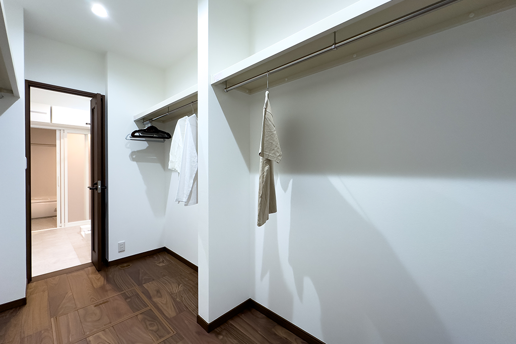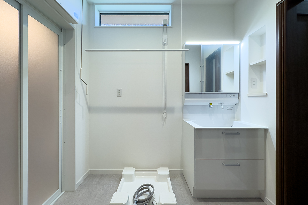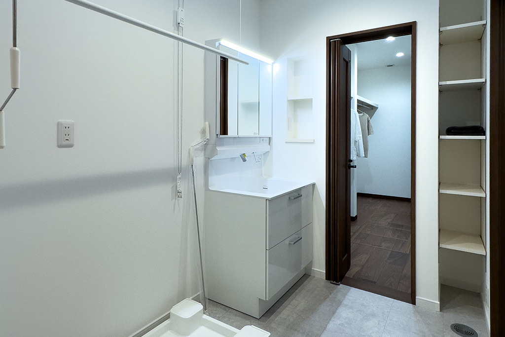 洗面脱衣室兼ランドリーとファミクロが直通で、脱衣・洗濯・乾燥・収納までを最短距離で完結。自分時間や家族との時間を生み出すことができる間取りです。