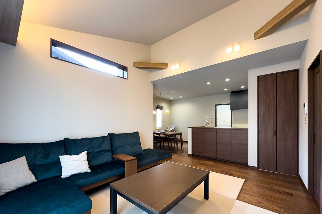 勾配天井の開放感と和のやすらぎが融合した、家族が自然に集まるくつろぎの場所になりました。