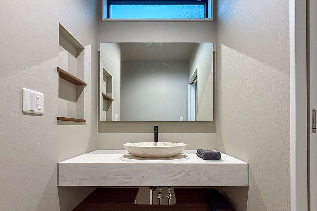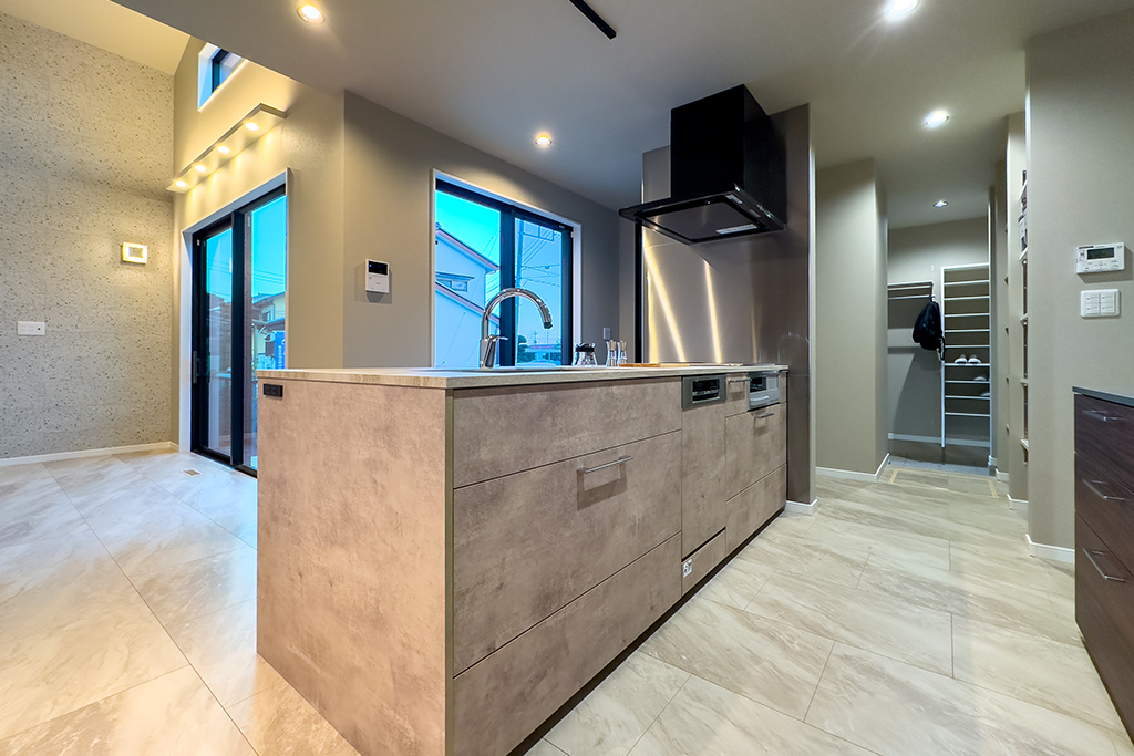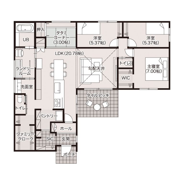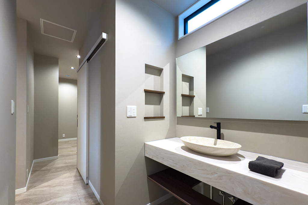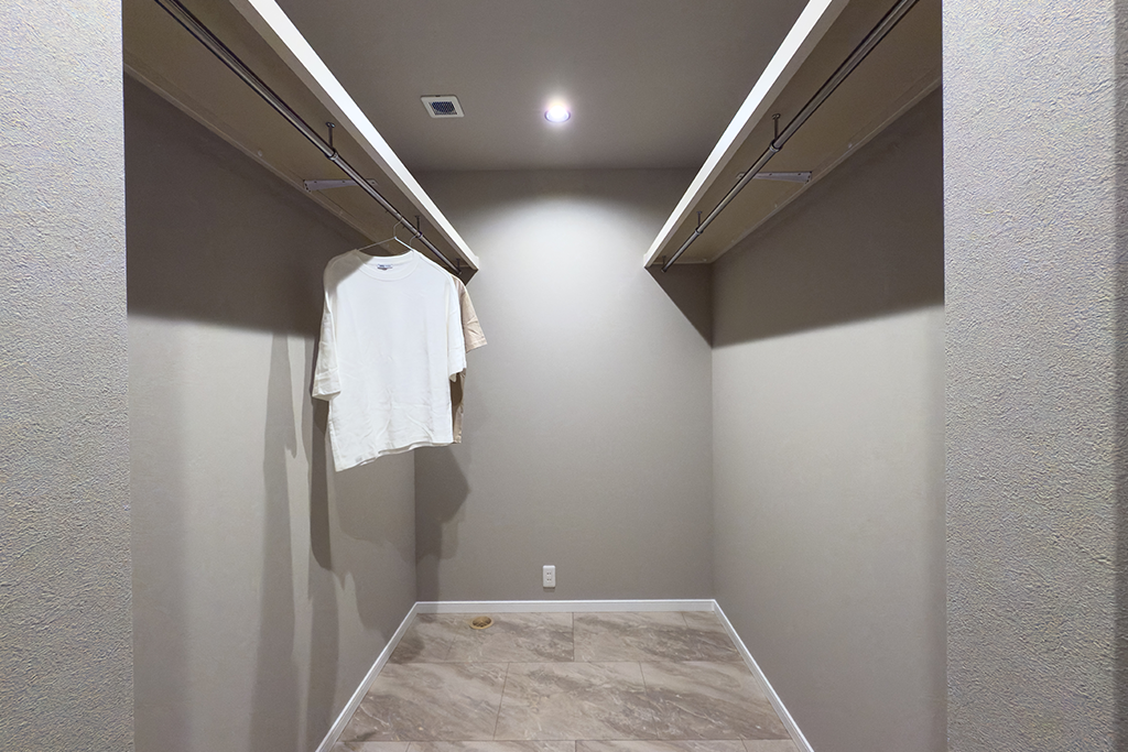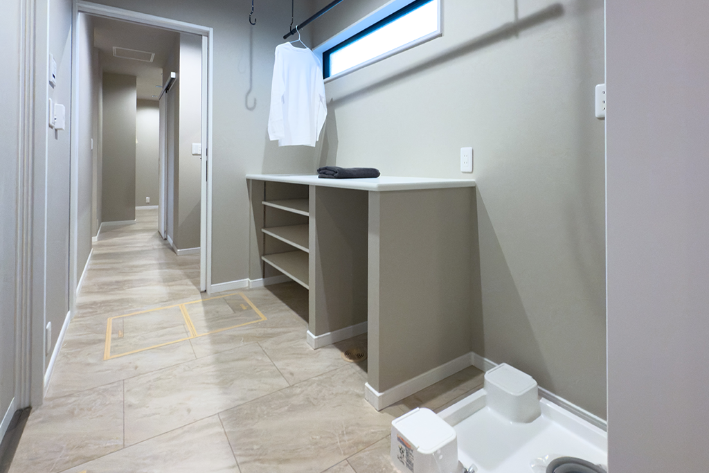 洗面脱衣室兼ランドリーとファミクロが直通で、脱衣・洗濯・乾燥・収納までを最短距離で完結。自分時間や家族との時間を生み出すことができる間取りです。
