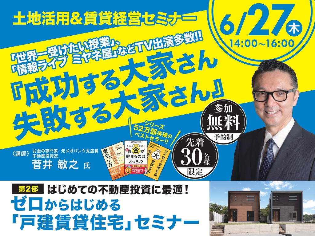 第1部は、「世界一受けたい授業」などTV出演多数の菅井敏行氏による特別セミナー「成功する大家さん、失敗する大家さん」。元メガバンク支店長で、著書『お金がたまるのは、どっち』シリーズが52万部突破の人気講師が、「成功する大家さん」の共通点、融資を上手に引き出す「銀行との正しい付き合い方」などをわかりやすく解説。