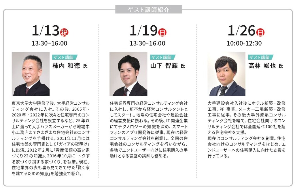 住宅の専門家として「良い住宅会社の選び方」を中立的な立場で解説するゲスト講師と、