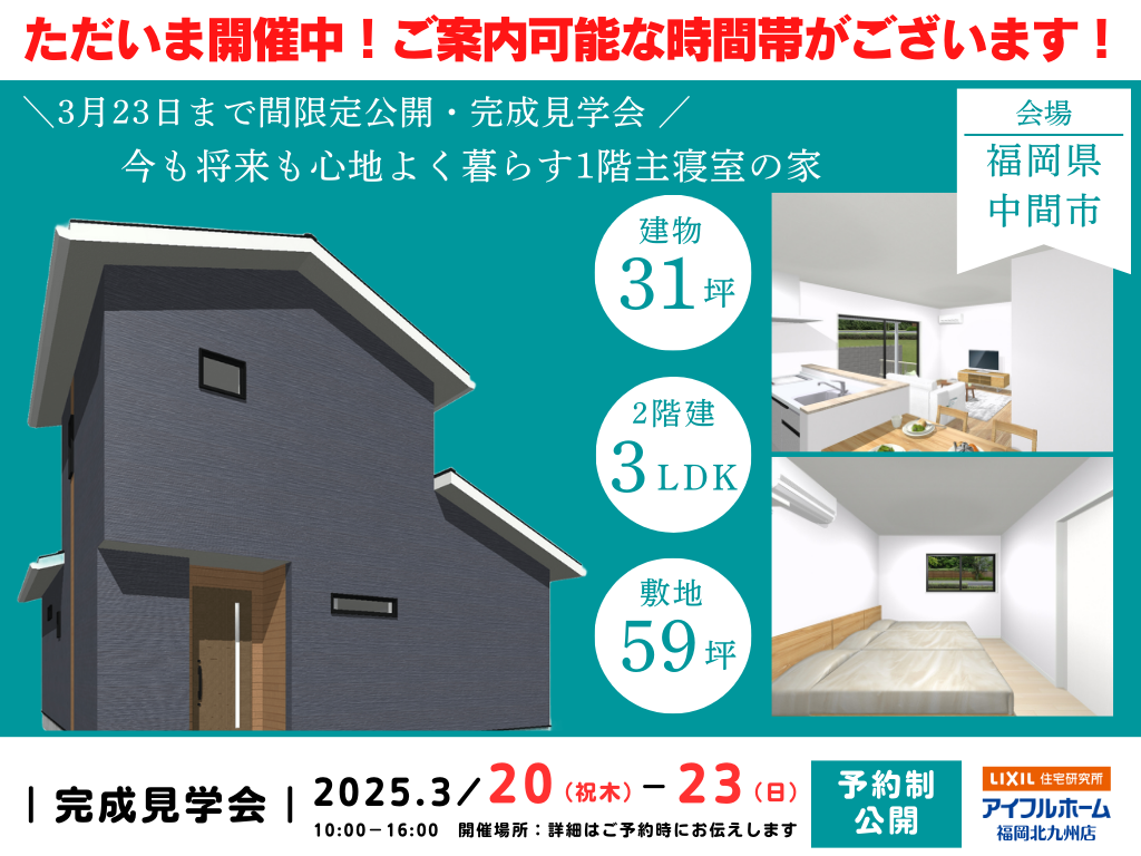 | タイトル | 【1組ずつ限定公開】2025年3月20日(祝木)~23(日)中間市|1階に主寝室がある家・完成見学会 |