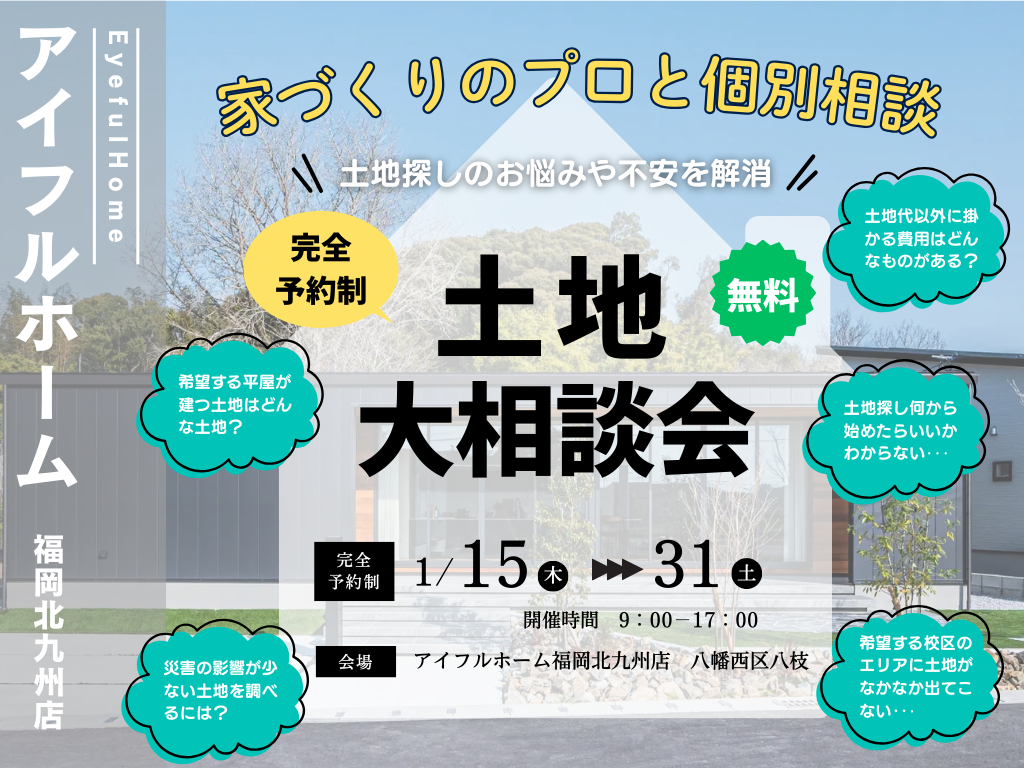 | タイトル | 【アイフルホーム福岡北九州店】土地探しにお悩みの方必見【家づくりのプロと個別相談】土地探し相談会 |