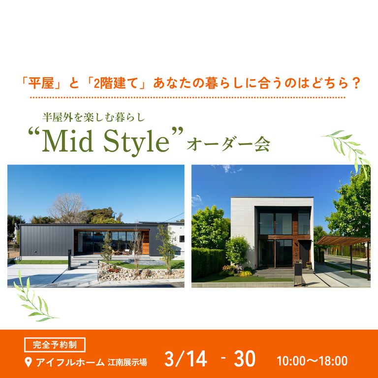 | タイトル | 【江南展示場】平屋と2階建てあなたの暮らしに合うのはどちら?Mid Styleオーダー会 |