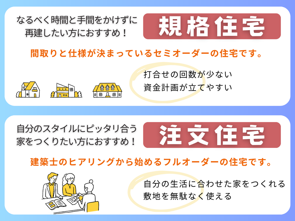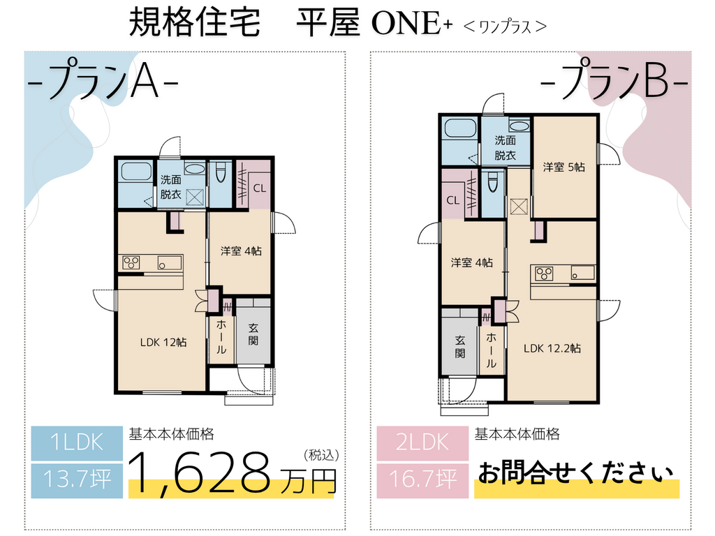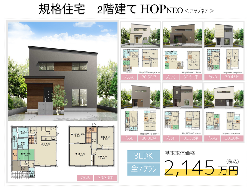 震災以来、お住まいの再建のご相談をたくさんいただいております。そのニーズに素早く応えられるよう規格住宅平屋「ONE+(ワンプラス)」、規格住宅2階建て「HOP NEO(ホップネオ)」をご用意いたしました。