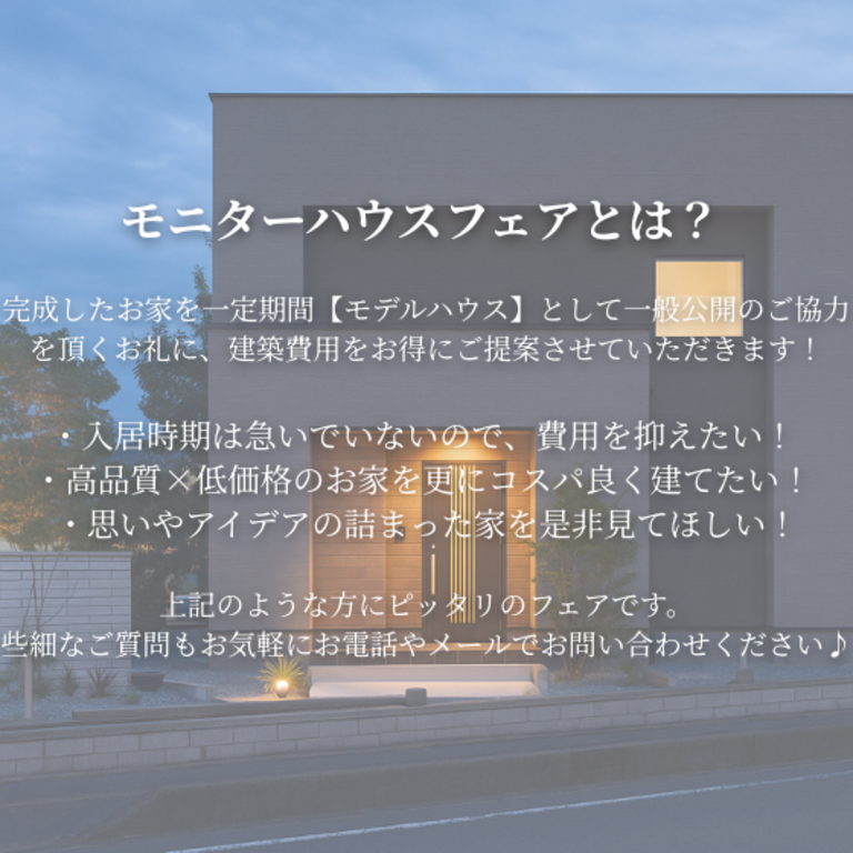 | タイトル | <今だけ!>【モニターハウス限定特典フェア】 高品質×低価格で賢くお家づくり! 残り2棟! |