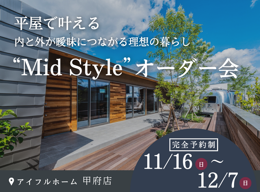 | タイトル | 平屋で叶える内と外が曖昧につながる理想の暮らし“Mid Style”オーダー会 |
