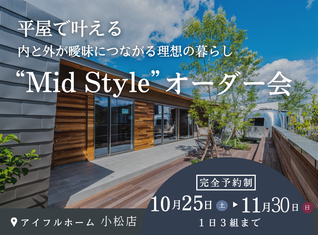 | タイトル | 平屋で叶える内と外が曖昧につながる理想の暮らし“Mid Style”オーダー会 |