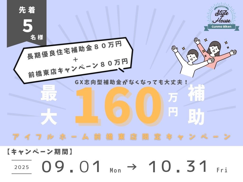 | タイトル | 最大160万円補助! アイフルホーム前橋東店限定キャンペーン |