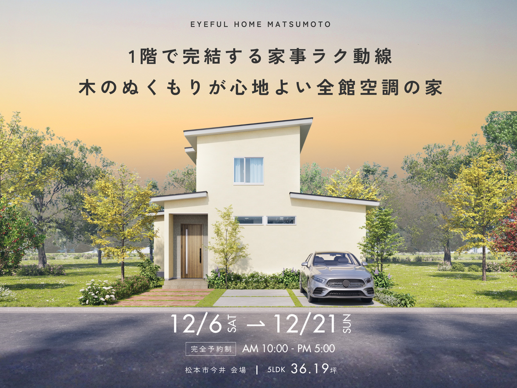 | タイトル | 【松本市今井会場】1階で完結する家事ラク動線 木のぬくもりが心地よい全館空調の家《完成見学会》 |