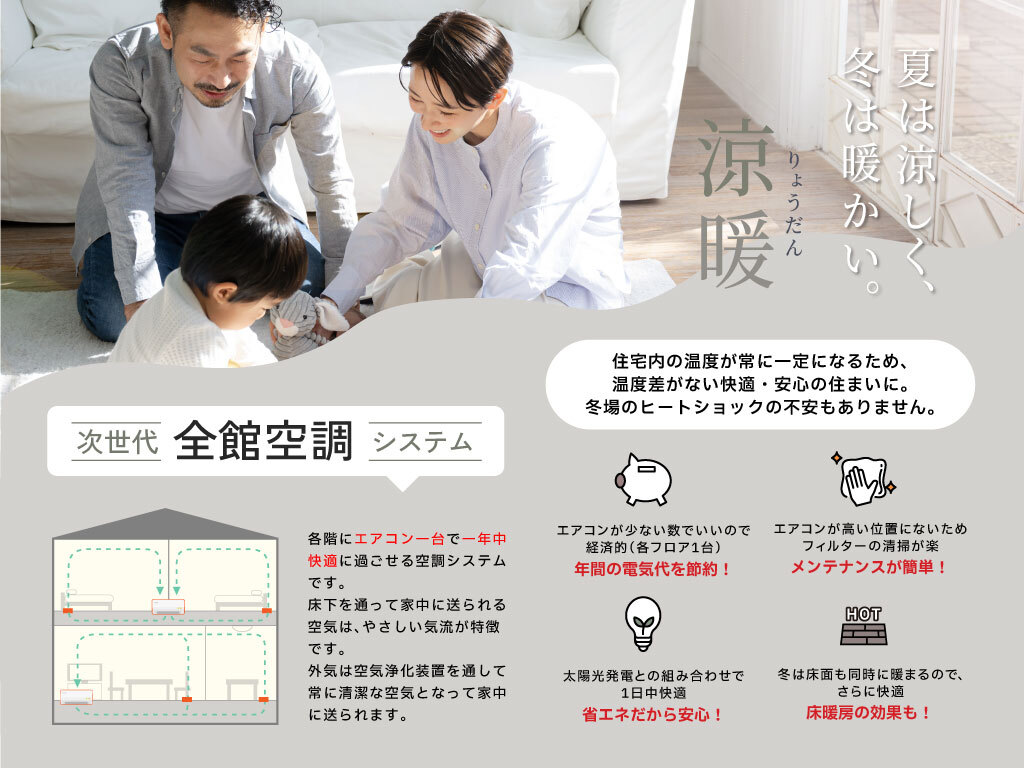 「世界最高レベルの断熱材×次世代全館空調システム」を標準搭載することで、1年間通して快適な生活を実現いたします。