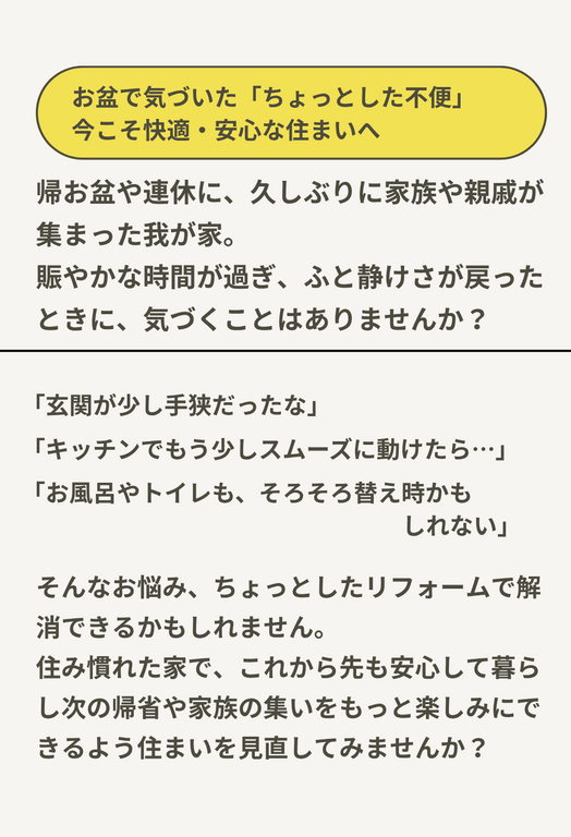 この機会に、これからの暮らしを見直し、次の帰省や家族の集いをもっと楽しみにできる住まいへ。