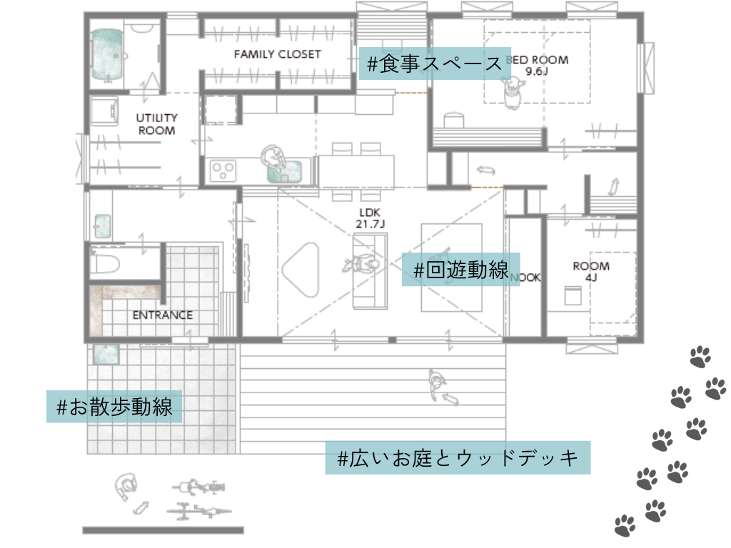 ペットとお子様が一緒にぐるぐる走り回れる動線。ペットの足すべりにも配慮したフロアで足腰の負担を軽減します。