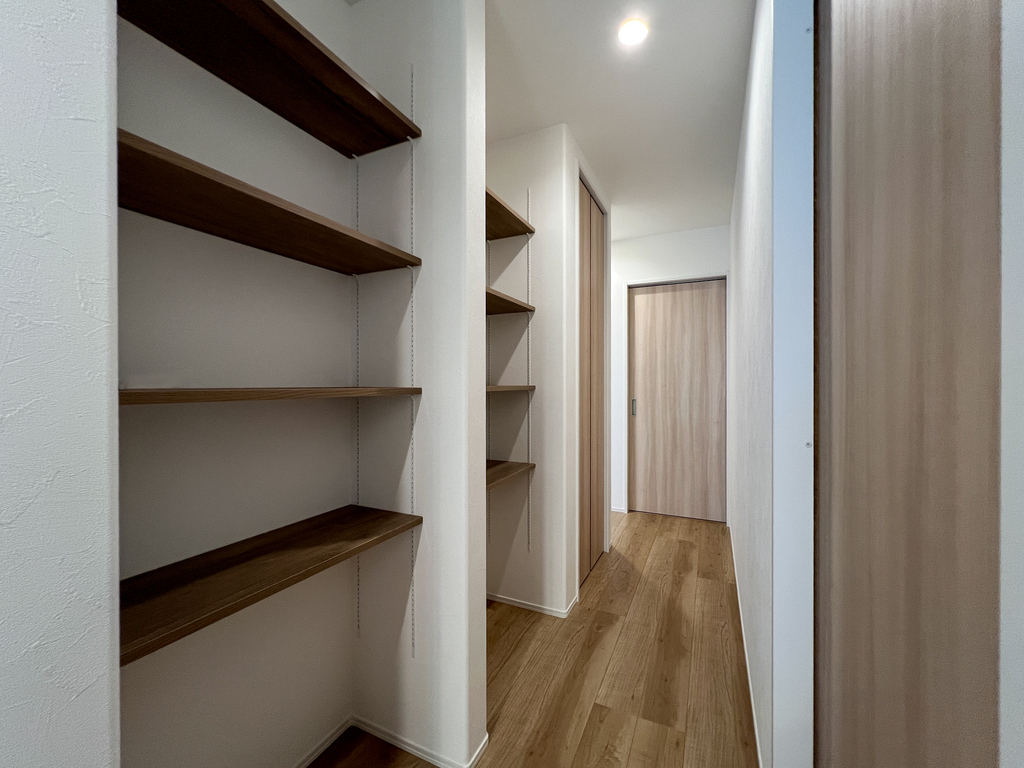 廊下には奥行き浅めの収納を3か所設置し、空間を無駄なく活用。キッチン横なのでパントリーとしても◎