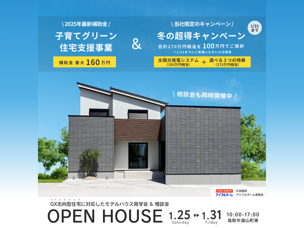 | タイトル | 【鳥取市|補助金160万円】GX志向型住宅対応!お得なお家づくり見学会※クオカード対象外店舗 |