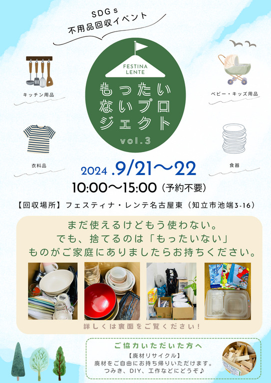 | タイトル | 第3回SDGs不用品回収イベント もったいないプロジェクト 【名古屋東エリア】 |