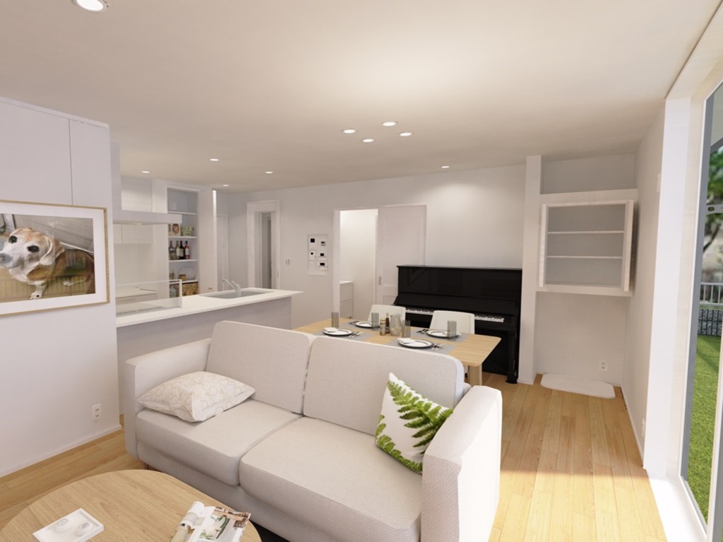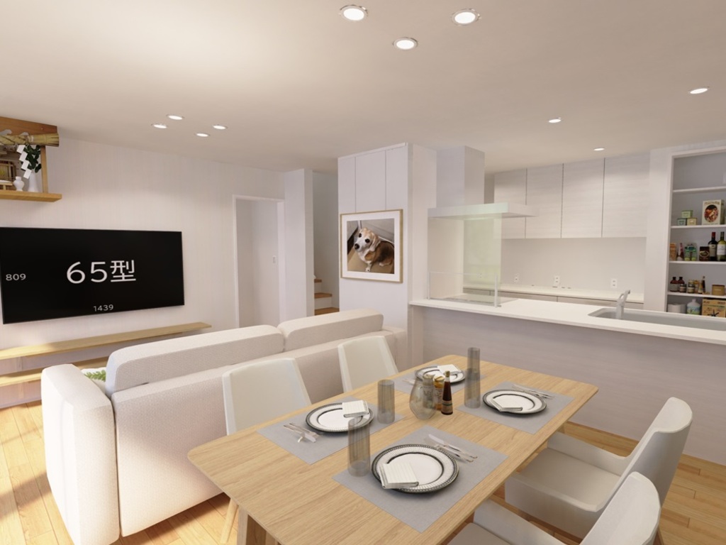LDKにワンちゃんのトイレスペースを設けました。1Fの床材は朝日ウッドテックのPlus for dogというワンちゃんが滑りにくいフローリングを採用しています。