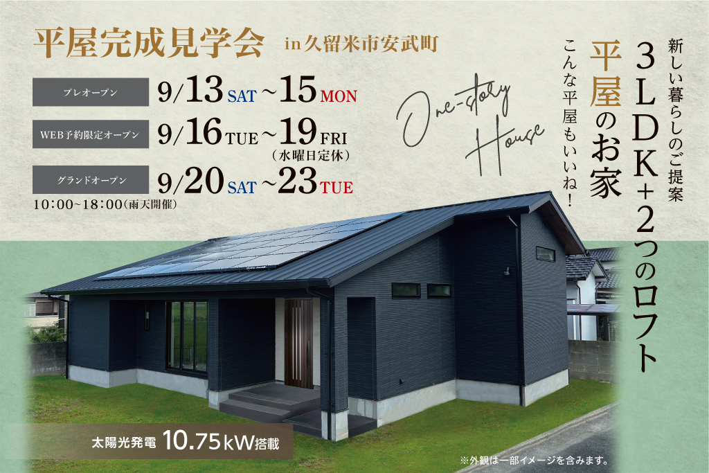 | タイトル | 久留米市安武町 9/13~9/23 平屋 完成見学会 |