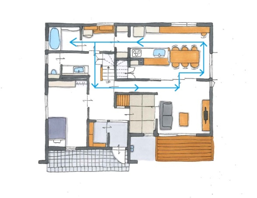 奥様の希望を一直線の水回り動線に360度行き来できる家事動線は、家事に育児に大変な奥様のストレスを0にするお手本にしたい動線です。