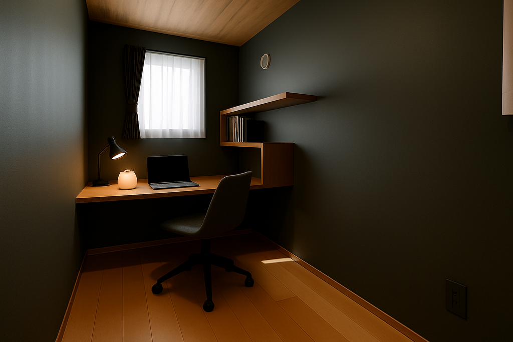 落ち着いた色合いで統一された書斎では、好きなことに没頭できるだけではなく、テレワークにも大活躍。