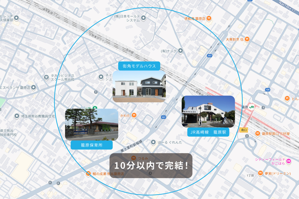 籠原駅徒歩9分、保育園まで徒歩1分、それでいて室内の広さや性能も両立しているというモデルになります。