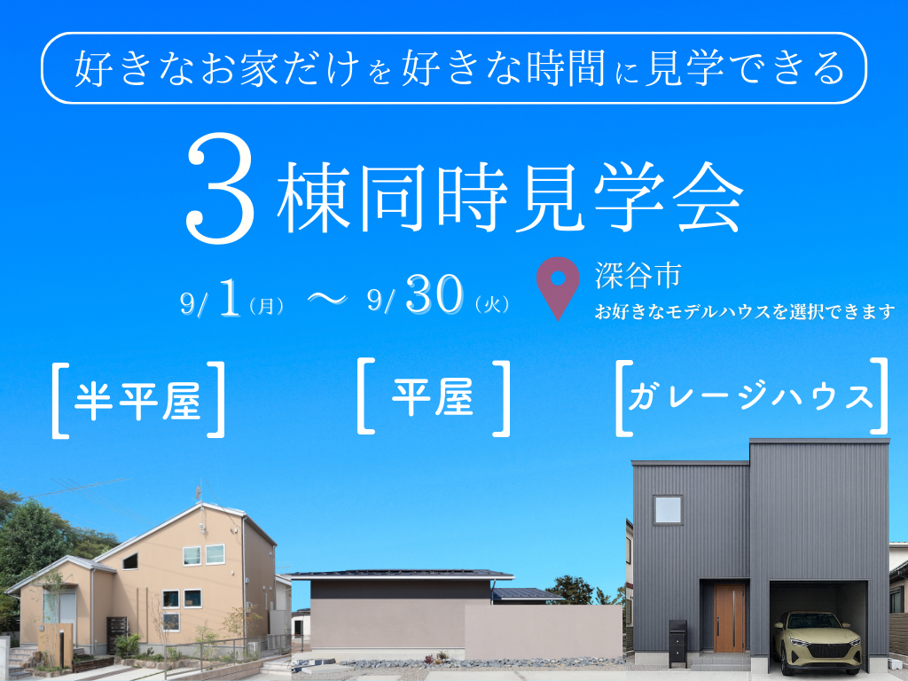 あなたのこだわりを実現できるおうち作りのヒントが満載、タイパ抜群の3棟同時見学会を開催します!