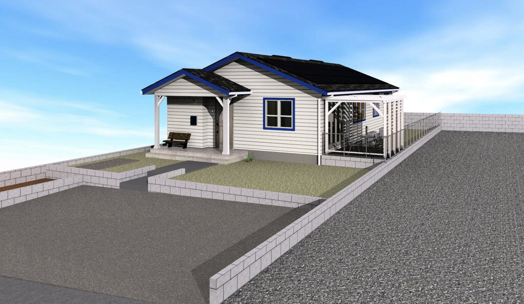 外観はお二人とも「ブルーが大好き!」ということで、ホワイトベース×ウルトラマリンブルーを採用しました。逆にポストはブルーと反対色のイエローをチョイス。くっきりとしたコントラストが爽やかなご夫婦にピッタリです。