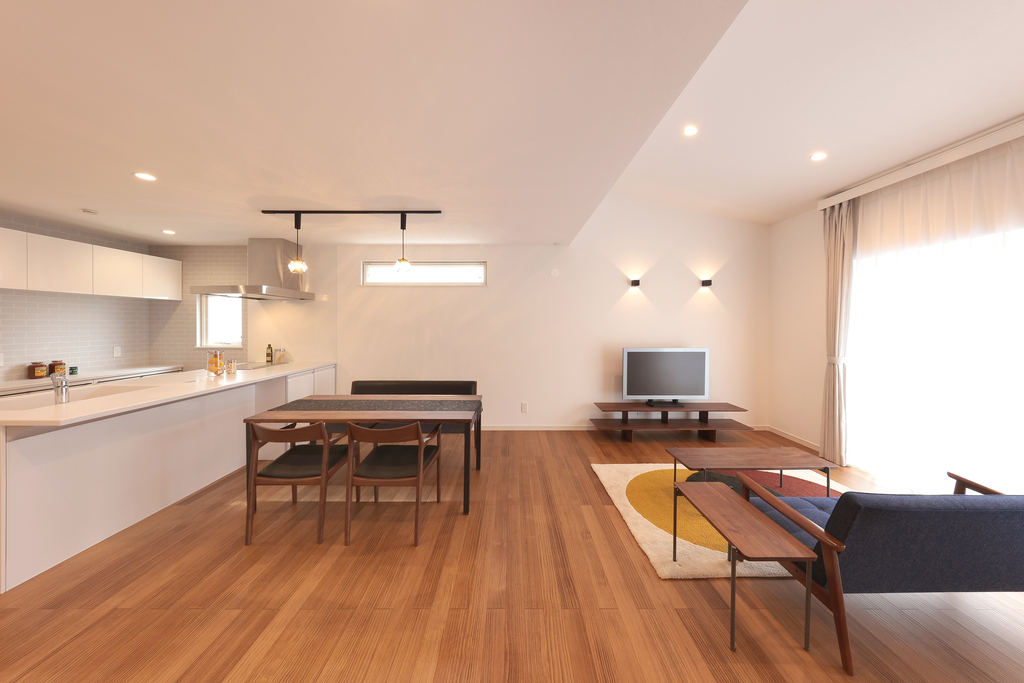 大きな窓から差し込む光、木の温もりを感じるフロア、家族が自然と集まる広々空間。秋の夕暮れにぴったりな雰囲気を、ぜひご体感ください。