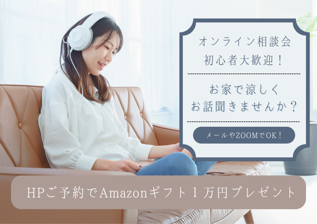 | タイトル | 【7月限定】お家で楽ちん!オンライン相談会★Amazonギフト1万円贈呈★ |