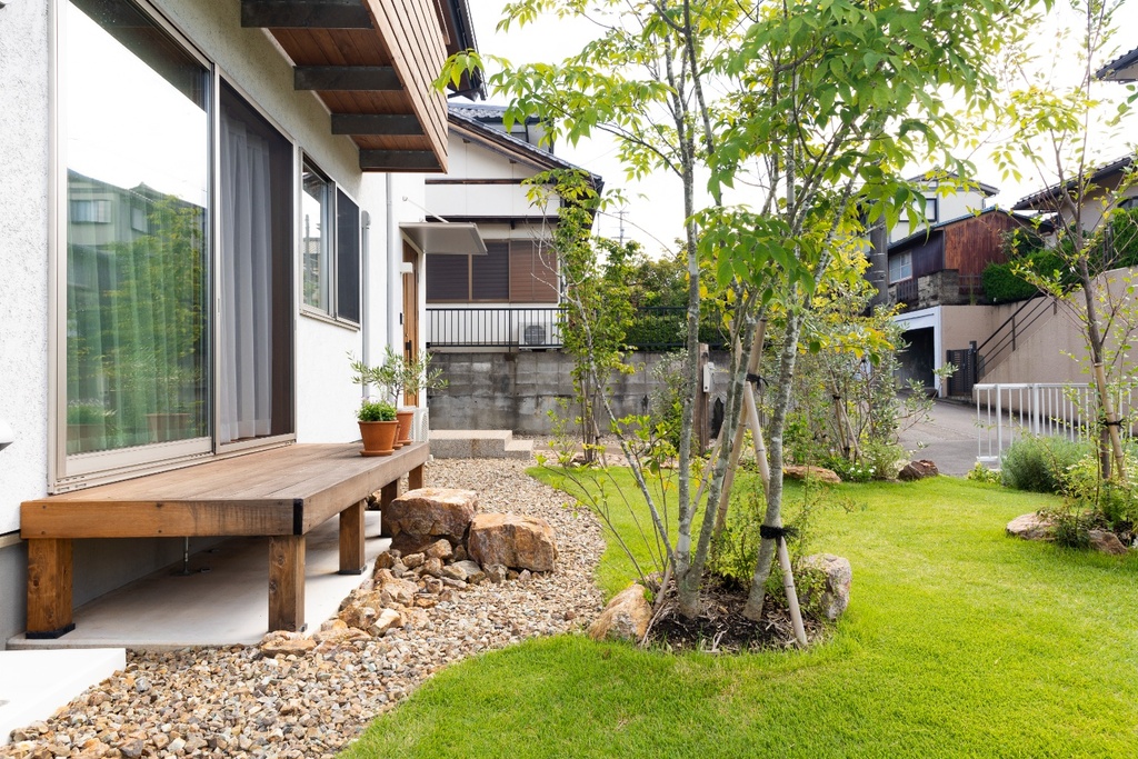 「子どもと一緒に旬の食材を育て、家族がほっこりできる手料理をつくりたい。」というお施主様の想いから、家庭菜園ができる庭を、リビングから繋がるかたちでつくりました。