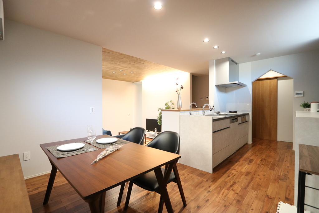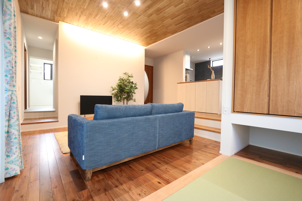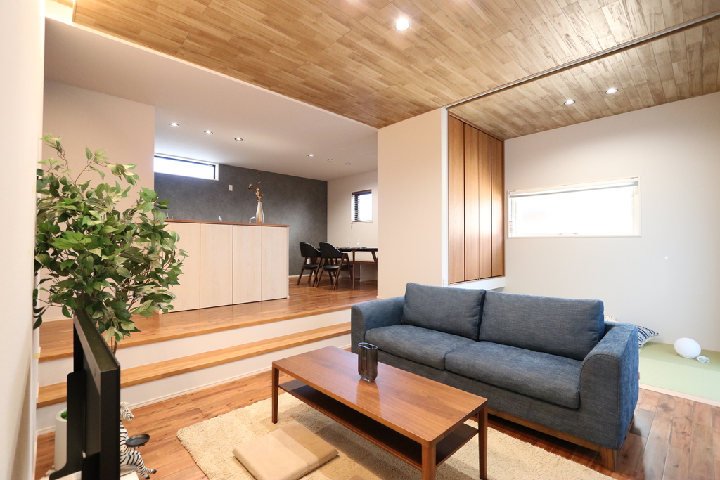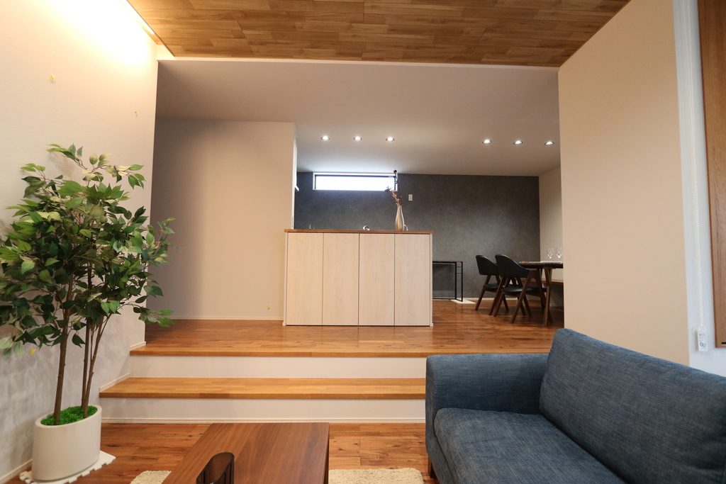 20帖超の広々LDKに、床を一段下げたサンクンリビングを採用。一段下がった空間が生む心地よさで、家族が自然と集まり、あたたかな空間です。