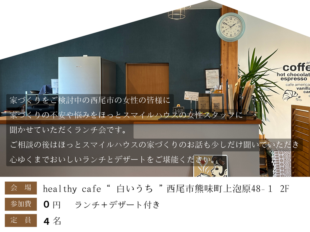 | 開催場所 | 愛知県西尾市熊味町上泡原48-1(2F)healthy cafe"白いうち" |