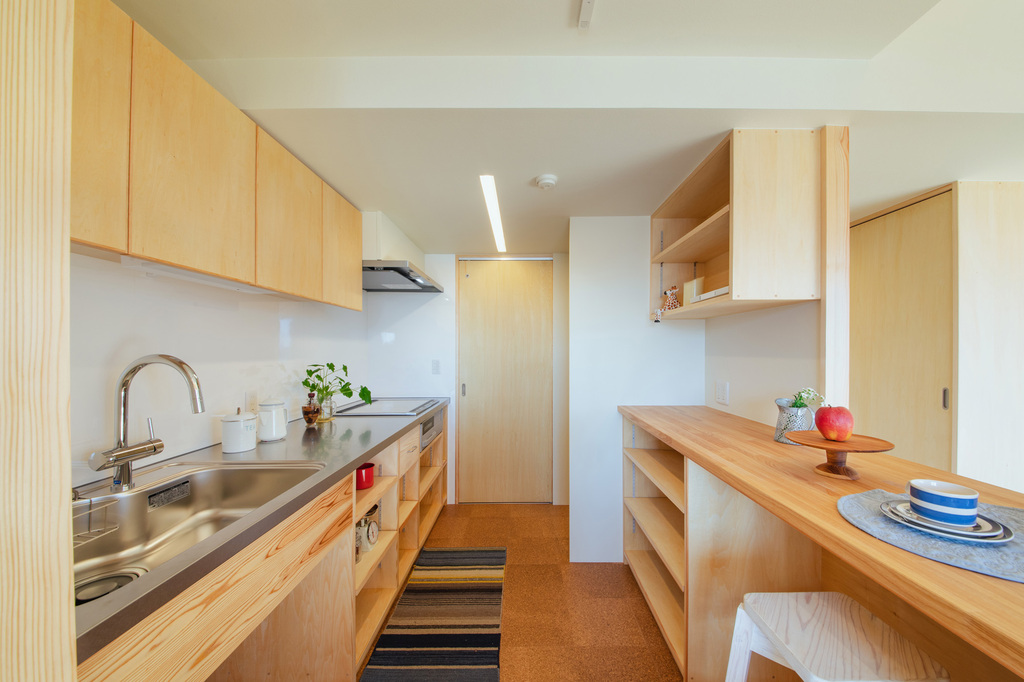 キッチン位置移動、キッチン造作、無垢床貼替、天井板張り、建具引き戸変更、クローゼット折れ戸撤去 他