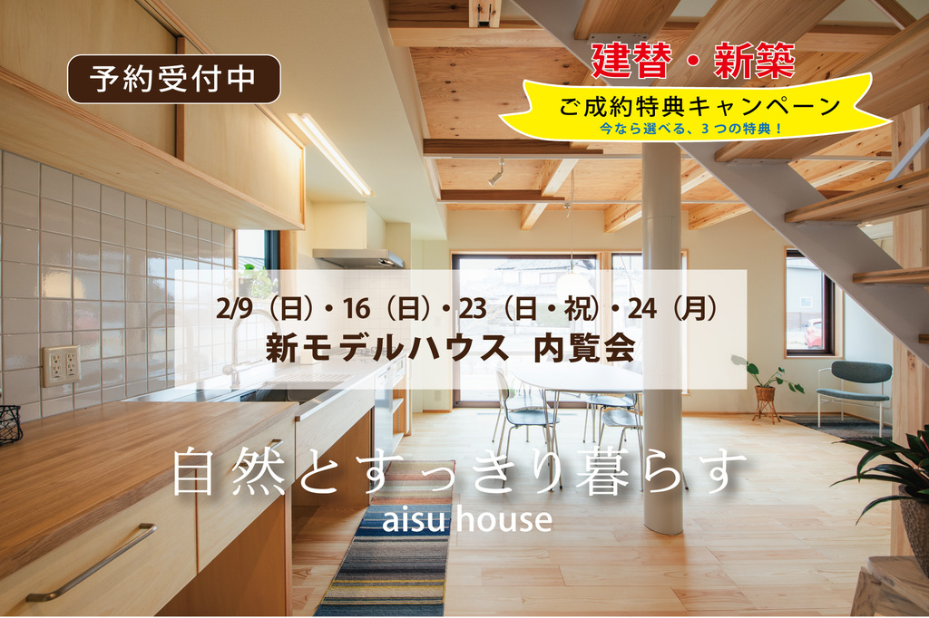 | タイトル | 自然とすっきり暮らす。aisuの家モデルハウス内覧会(予約制) |