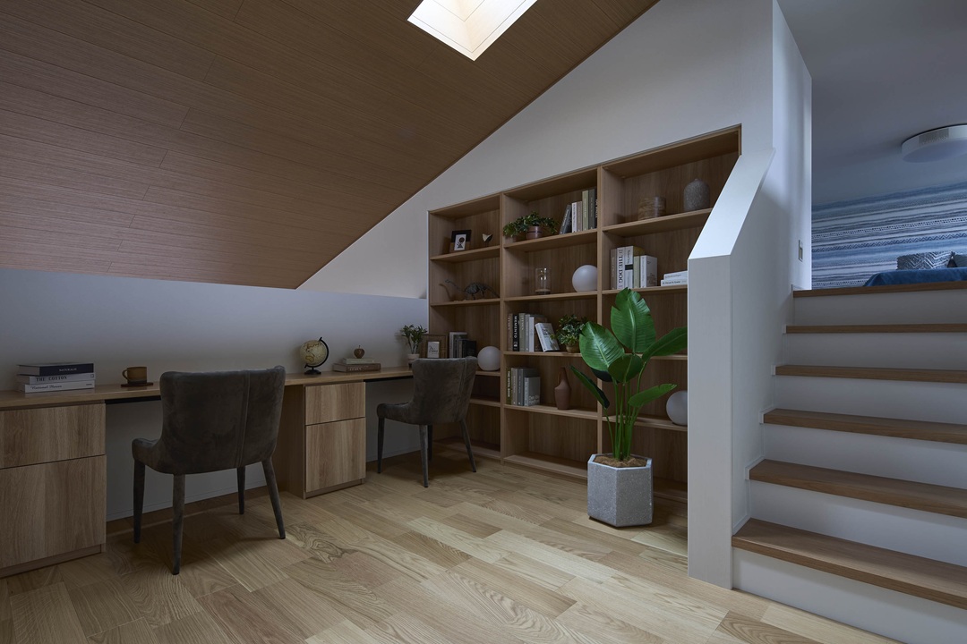 平屋でありながら中二階を設けることで、ご夫婦それぞれのワークスペースとして活用✏