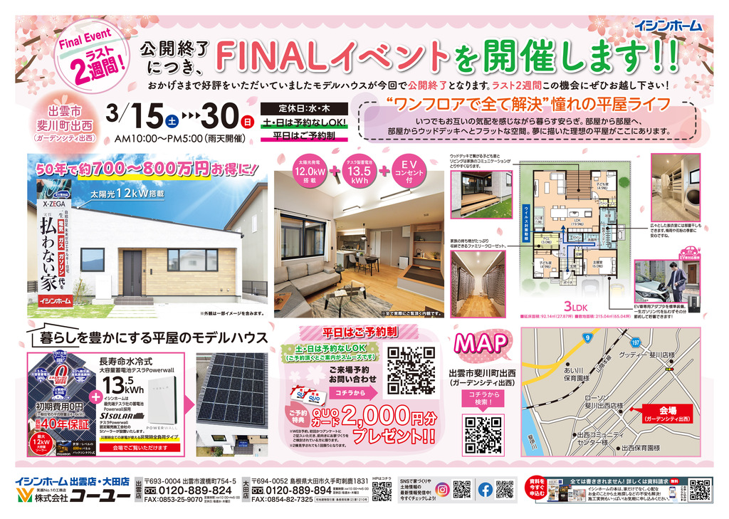 皆様、ついにこの日がやってきました!出西モデルハウスのファイナルイベントを開催します。この機会を逃すと、もう二度と体験できない特別なイベントです。ぜひ、あなた自身の目でその魅力を確かめに来てください。