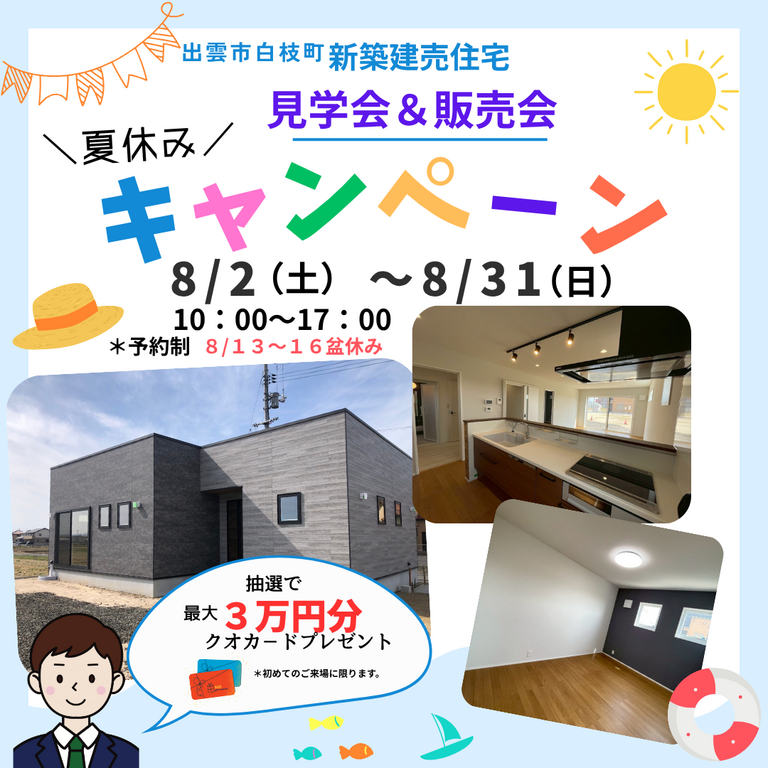 | タイトル | 白枝建売住宅 見学会&販売会 夏休みキャンペ-ン |