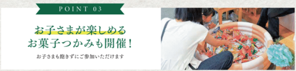 お子さまも楽しめる「お菓子つかみ」もご用意しています。ご家族で安心してご来場ください!
