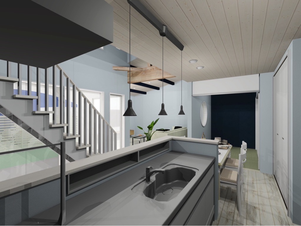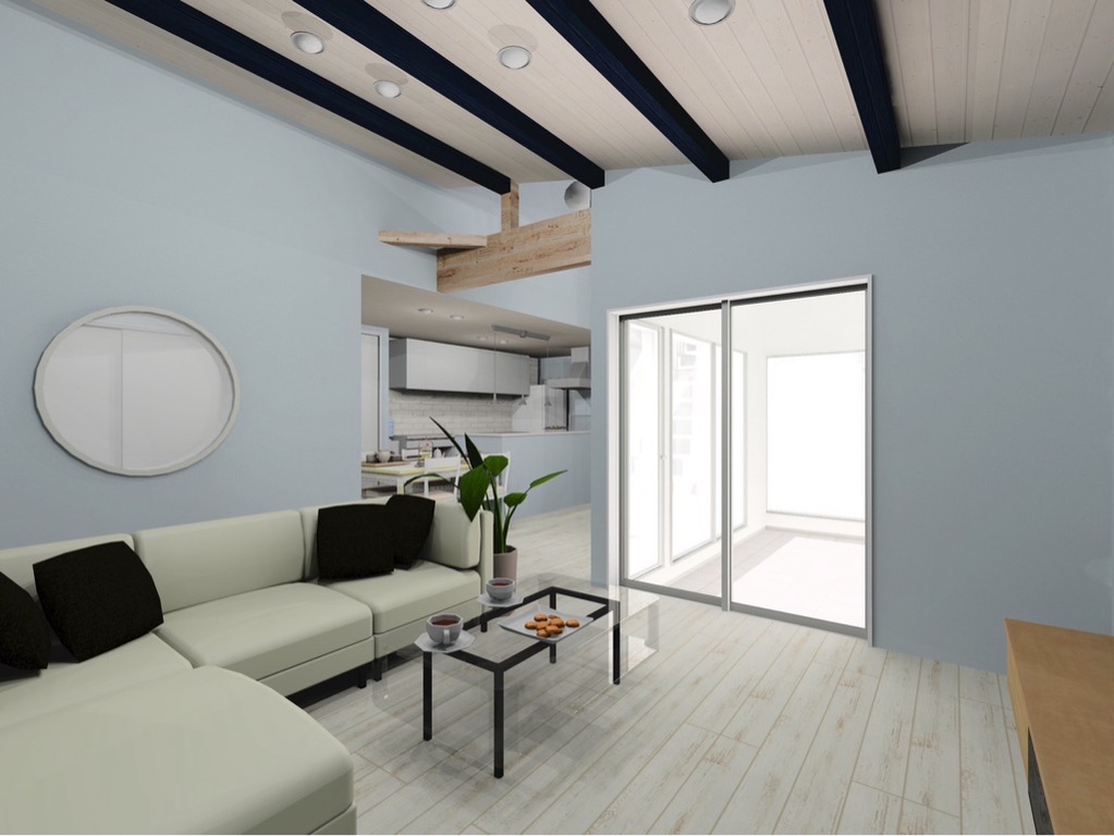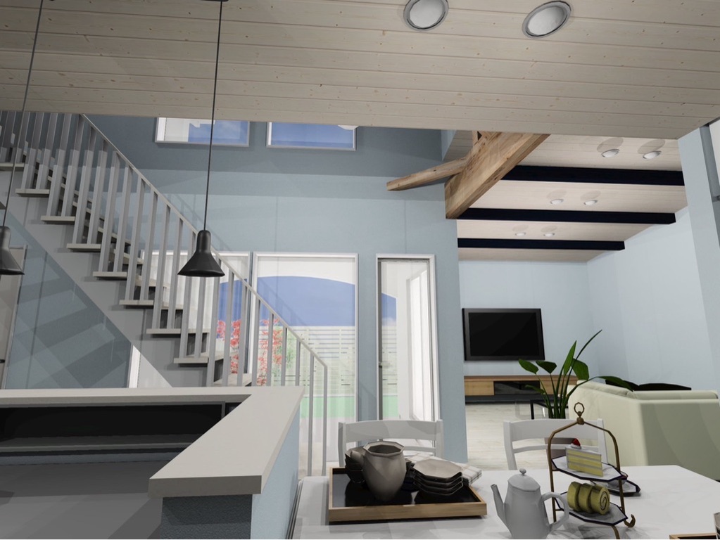 ②26帖の広々としたLDKは吹き抜けで開放感があり、スケルトン階段がオシャレ