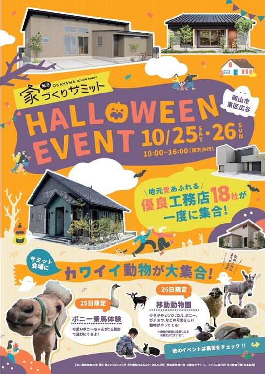 10/25(土)・26(日)の2日間、家づくりサミットに、かわいい動物が大集合!お菓子のプレゼントやマジックショーなど、盛りだくさんの2日間です。2日間とも予約不要で、ご覧いただけますので、是非ご家族お揃いでご参加ください。