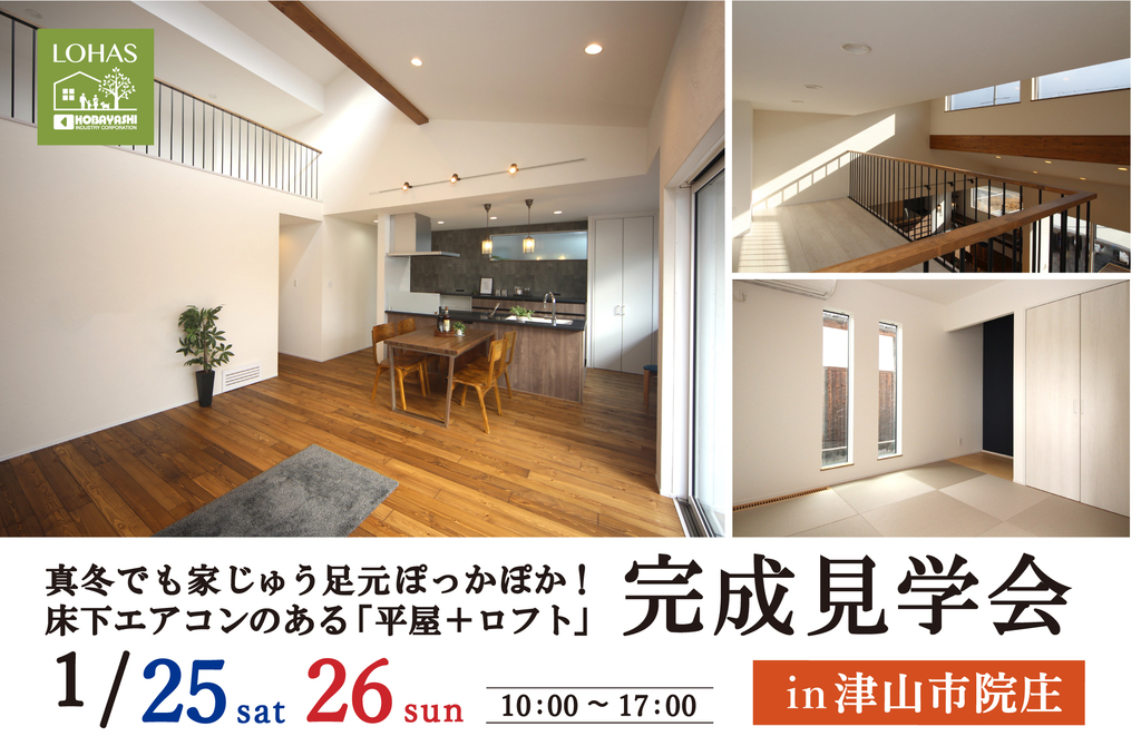 | タイトル | 床下エアコンで真冬でも家じゅう足元ぽかぽか!シンプルモダンな「平屋+ロフト」の完成見学会 |