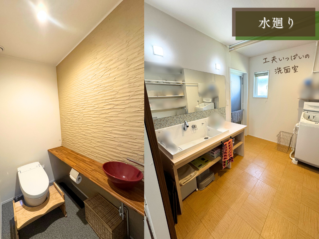 水回りも和をイメージしたテイストの素材をチョイスして、落ち着きのある空間になっています。トイレは土壁を採用し、消臭効果もあります。洗面の床は竹素材風のCF材を採用し、見た目と使い勝手を賢く両立されています。