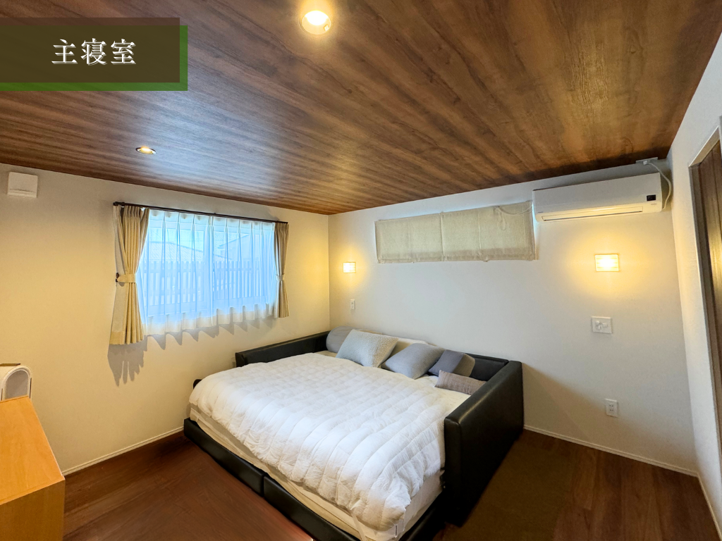 主寝室は、木目天井に、ダークカラーの床材を使用し、落ち着いた雰囲気。