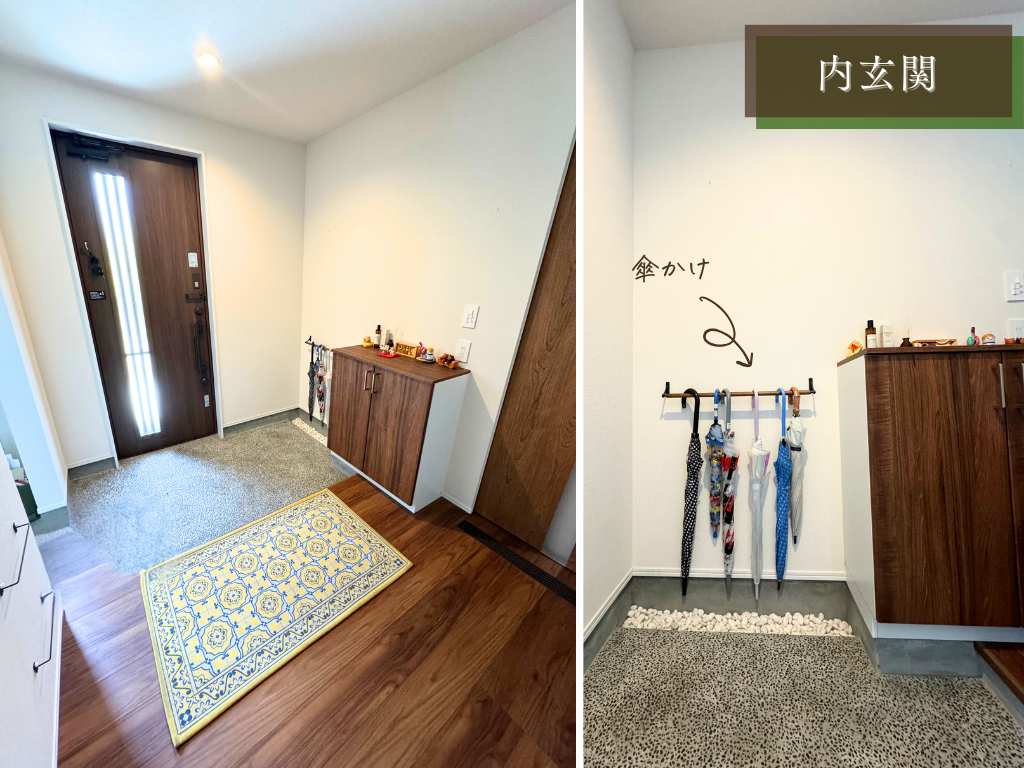 内玄関にも、洗い出し仕上げ風の床を選び、和を感じさせる上品な印象になっています。