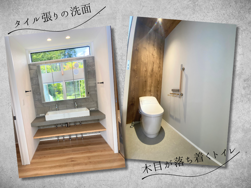 こだわりの水回りは、木目とグレーのコンビネーションで、上質な空間になっています。