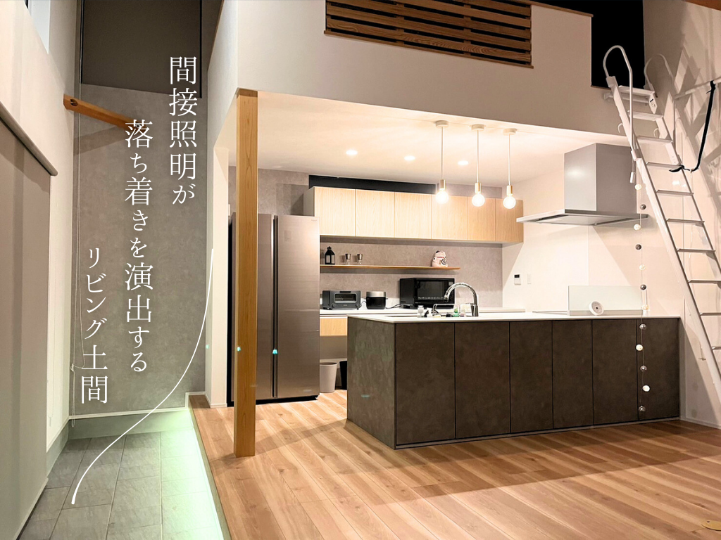 夜には、リビングの土間を間接照明が照らし、落ち着く空間を演出してくれます。