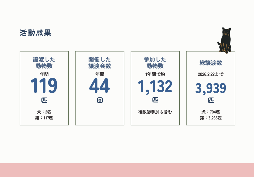 「自分たちにできることを少しずつ」を理念に、これまでに約4,000匹近くの犬や猫たちが新しい家族と出会うお手伝いをしてきました。