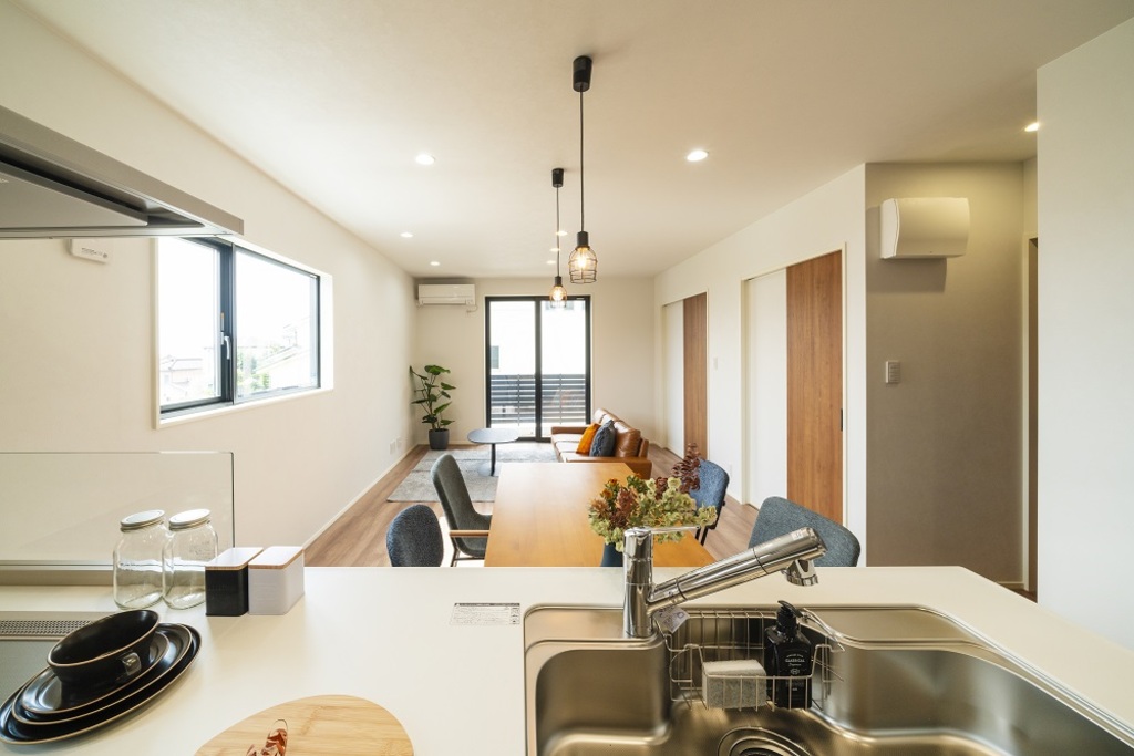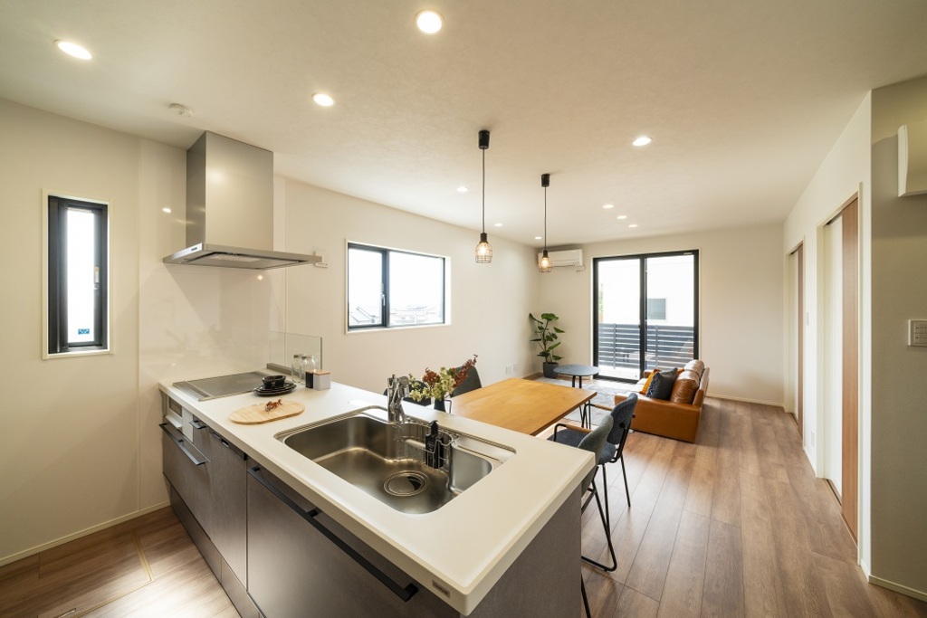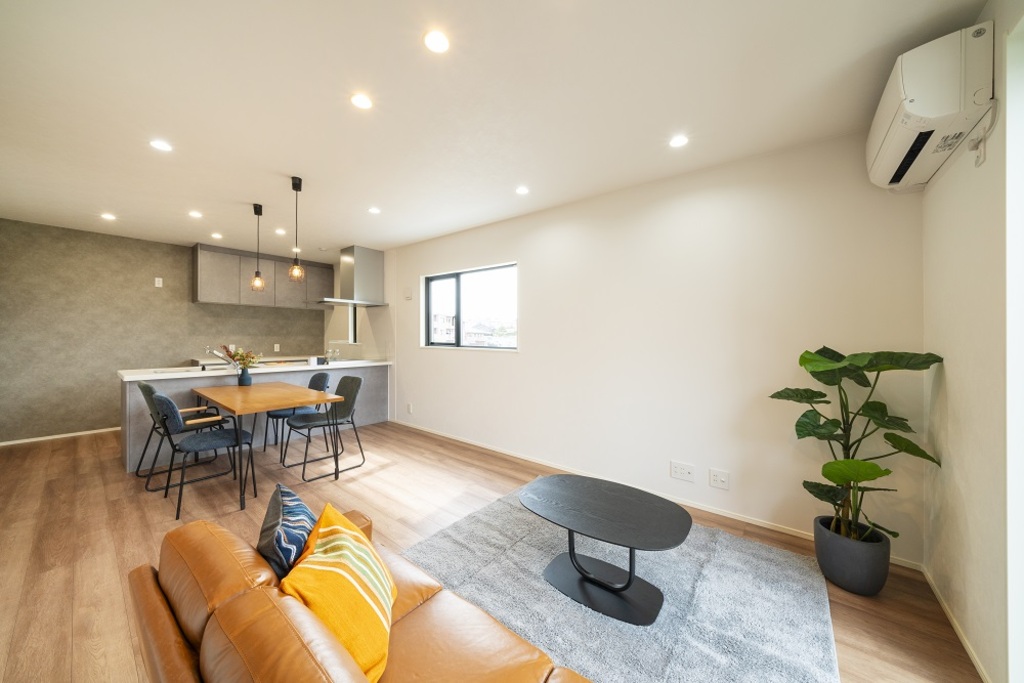 建売住宅よりも高気密・高断熱な性能を誇り、光熱費を削減。ストレスフリーで快適な住環境をお届けします。さらに、リビングエアコンやカップボード、ガス乾燥機など充実した標準設備を完備。