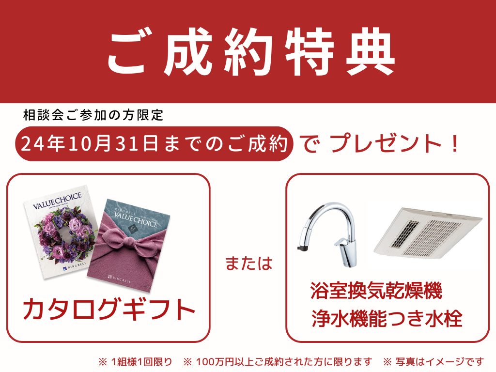 当日イベントご来場のうえ、期間中にご成約をいただいた方限定で、選べるカタログギフトまたはオプションアップをプレゼント!
