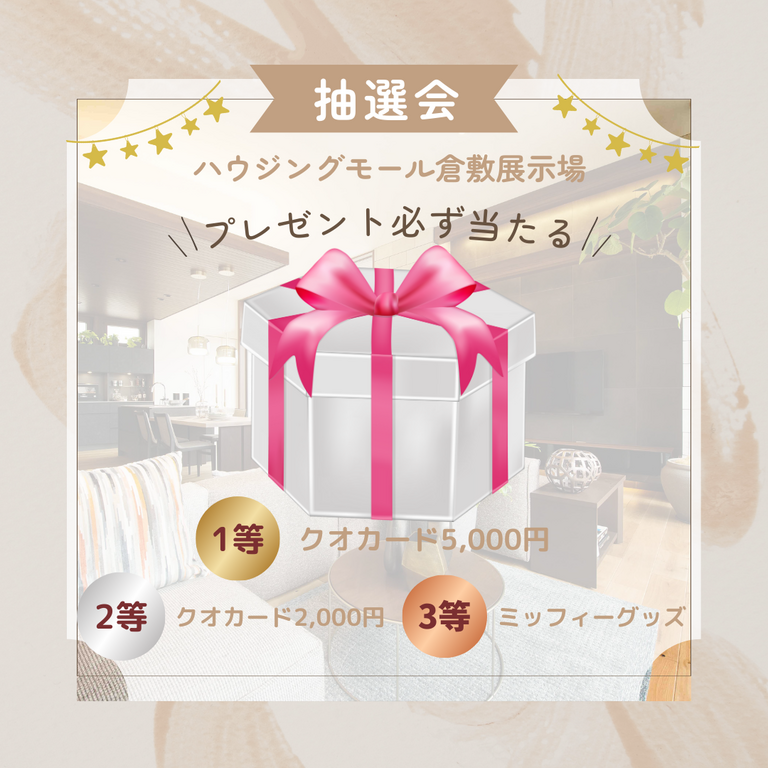 WEBよりご予約の上、ハウジングモール倉敷展示場にご来場いただき下記の対象条件を満たしたお客様にハズレなしの抽選会をプレゼント!!